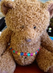 I have worked in other drug rehab facilities where adults toting stuffed animals were the norm. In the mid-1990s I subbed in a hospital treatment center for juveniles where the residents were required to carry a stuffed animal the first 30 days of the program. Stuffies make us feel secure. Using a teddy bear is healthier than using drugs or alcohol, which many do to suppress their emotional insecurities. So I wasn’t surprised when Xavier showed up today with a well-worn teddy bear wearing a rainbow necklace around its belly.